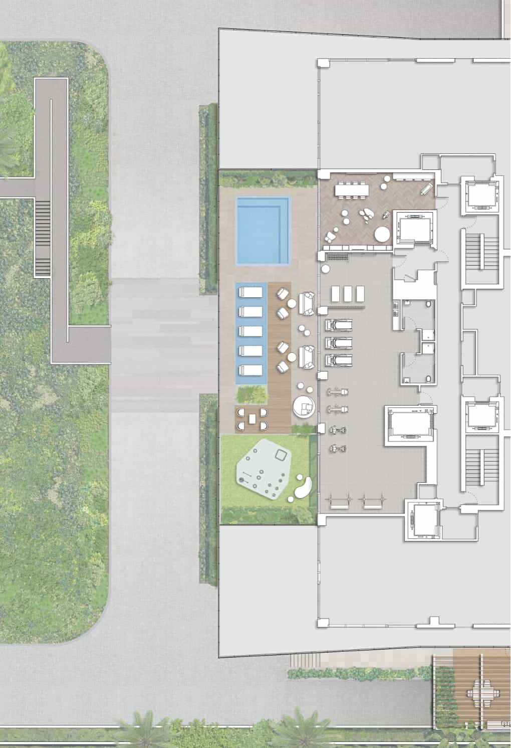 The third floor features a state-of-the-art fitness facility designed for indoor-outdoor training, along with an adjacent children’s entertainment room. A spa pool helps residents feel restored and rejuvenated.