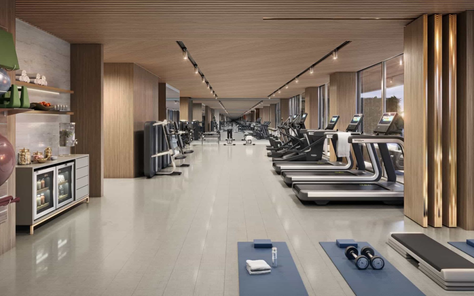 On the third-floor sunset deck, the indoor Technogym fitness center and outdoor MyEquilibria gym provide training flexibility while the spa pool allows for post-workout relaxation. The children’s room lets owners entrust young ones with caregivers while they pursue their wellness goals or attend private training sessions.